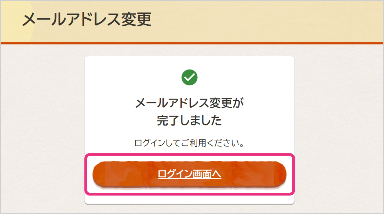 届いたメールの認証用URLをクリックすると、メールアドレスの変更が完了します。『ログイン画面へ』をクリックし新しいメールアドレスでログインしてください。