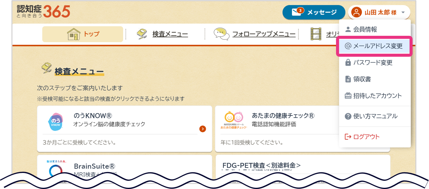 ログイン後、画面右上の氏名をクリックし表示されるメニューから『メールアドレス変更』をクリックしてください。