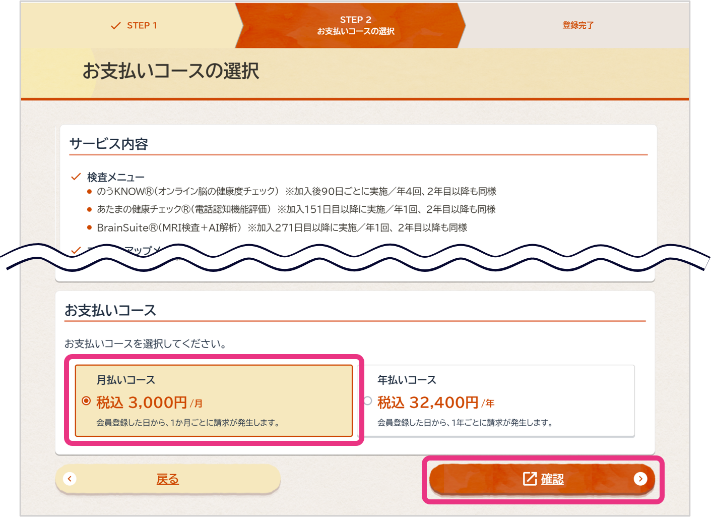 お支払いコースを選択し、『確認』をクリックしてください。