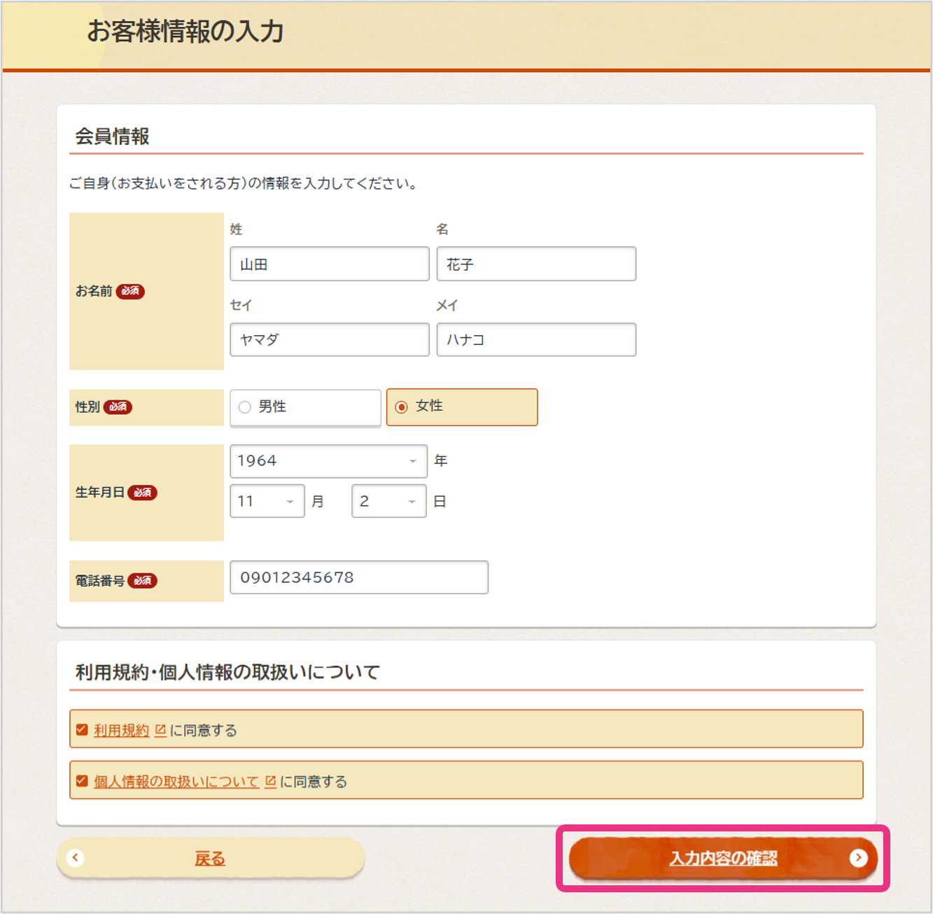 会員情報を入力し、『入力内容の確認』をクリックしてください。