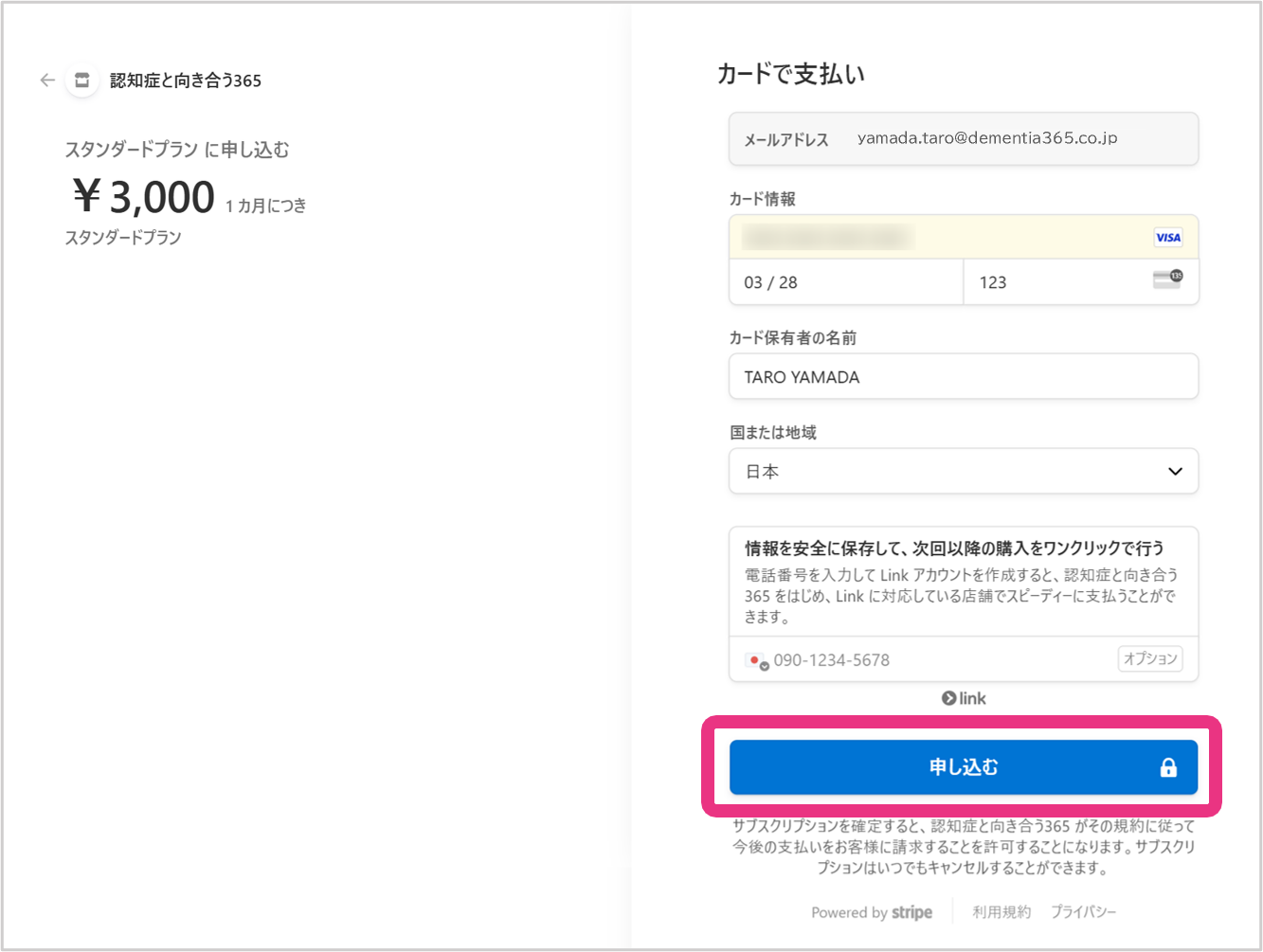 会費のお支払いに利用するカード情報を入力の上、『申し込む』をクリックしてください。