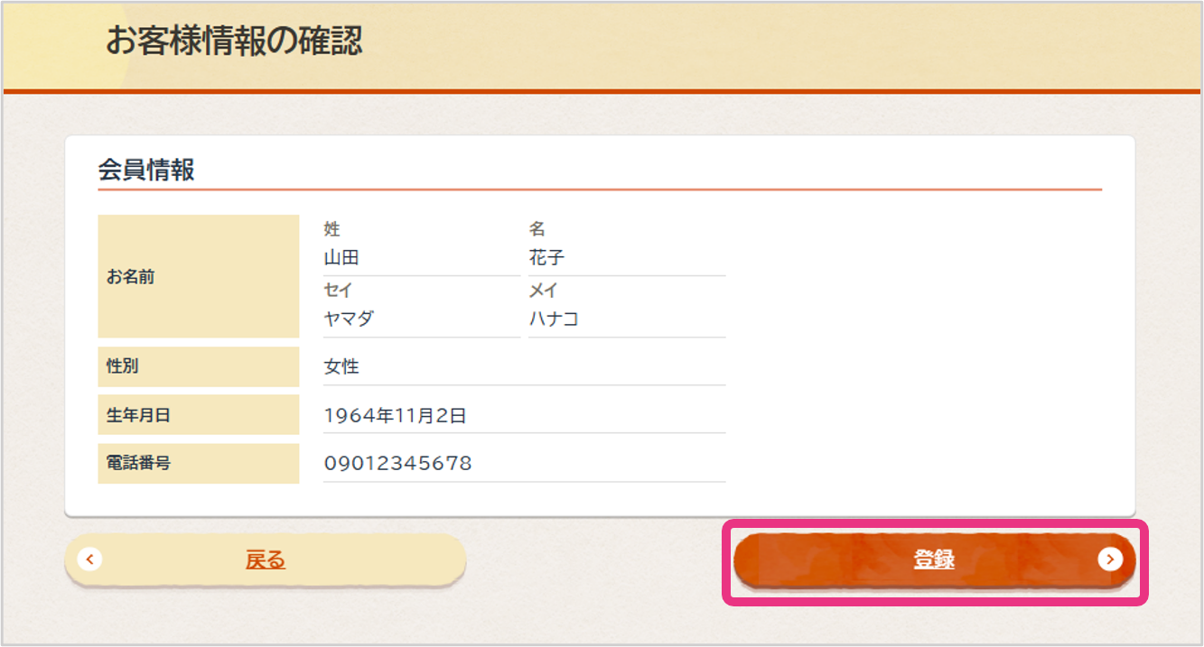 会員情報の確認画面が表示されますので、登録内容に誤りがないことを確認の上、『登録』をクリックしてください。