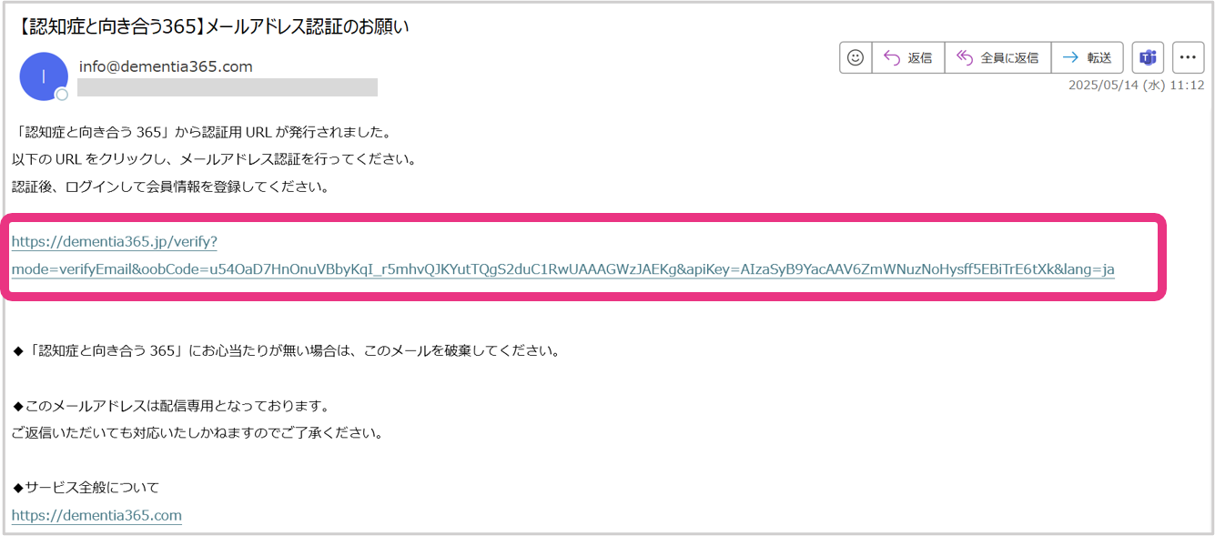 ・ドメイン指定受信や受信拒否などを設定されている場合は、「@dementia365.com」からのEメールを受信できる状態にした上で認証メールを再送してください。