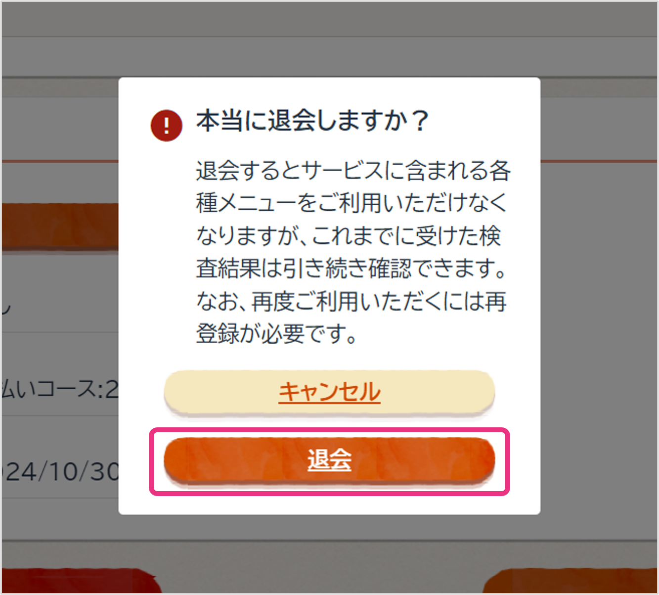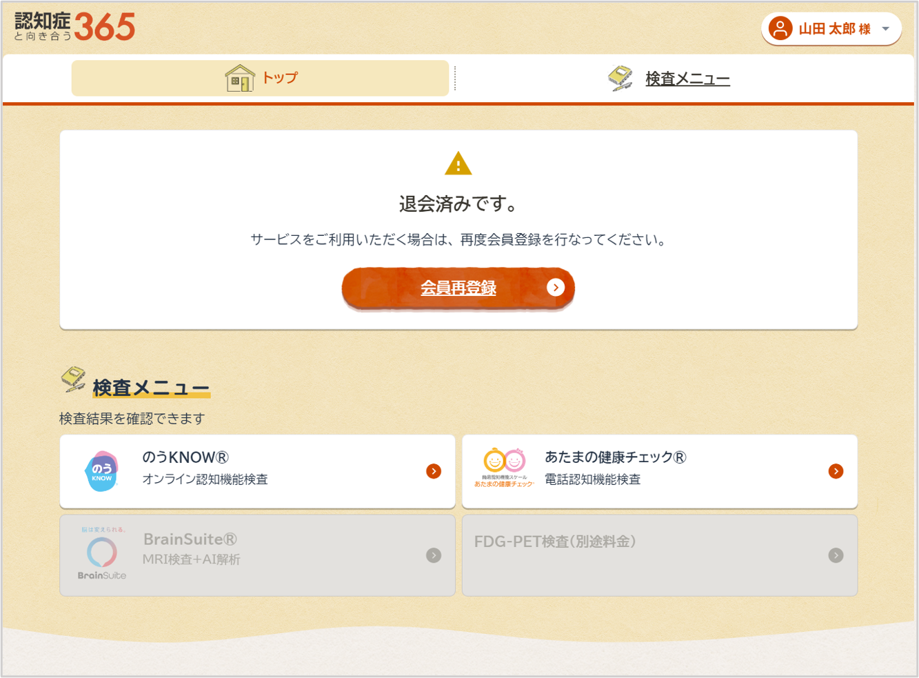 引き続きログインはできますが、サービスに含まれる各種メニューはご利用いただけなくなります。なお、これまでに受けた検査メニューの結果は今後もトップ画面からご確認いただけます。再度すべてのメニューをご利用いただくには再登録が必要です。