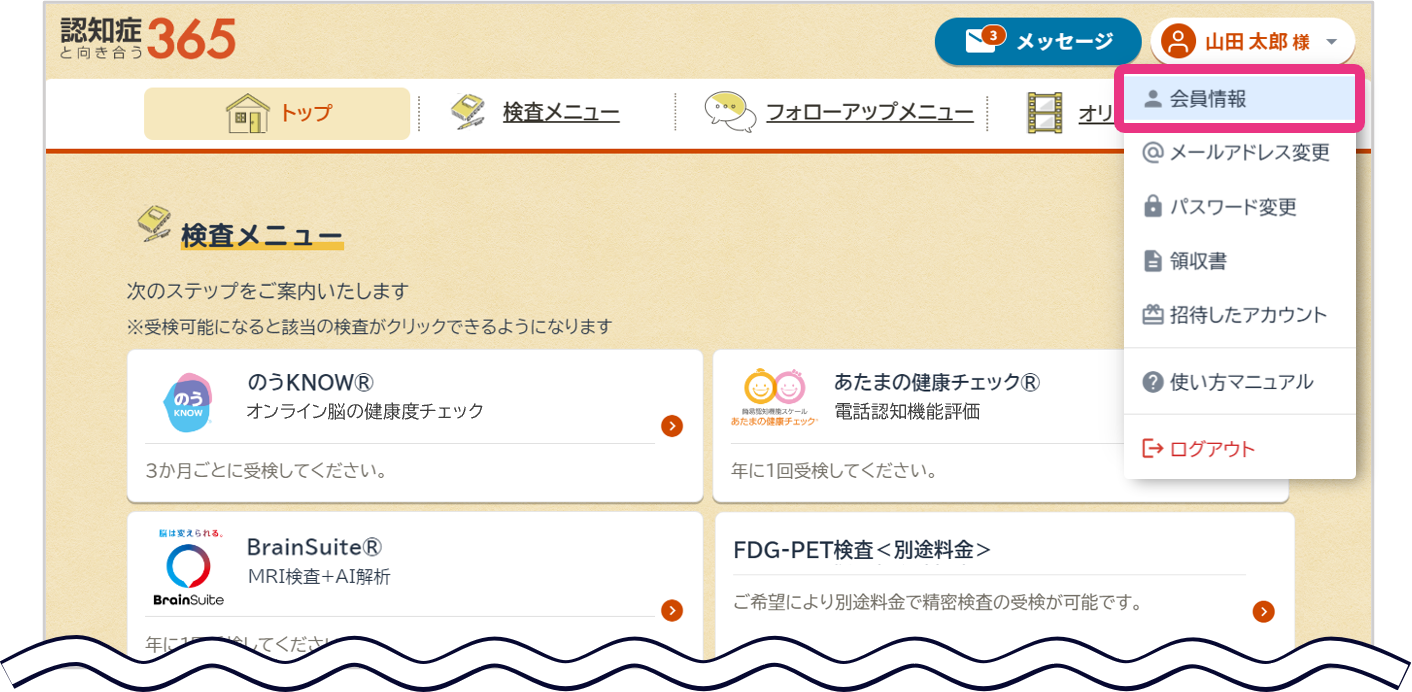 ログイン後、画面右上の氏名をクリックし表示されるメニューから『会員情報』をクリックしてください。