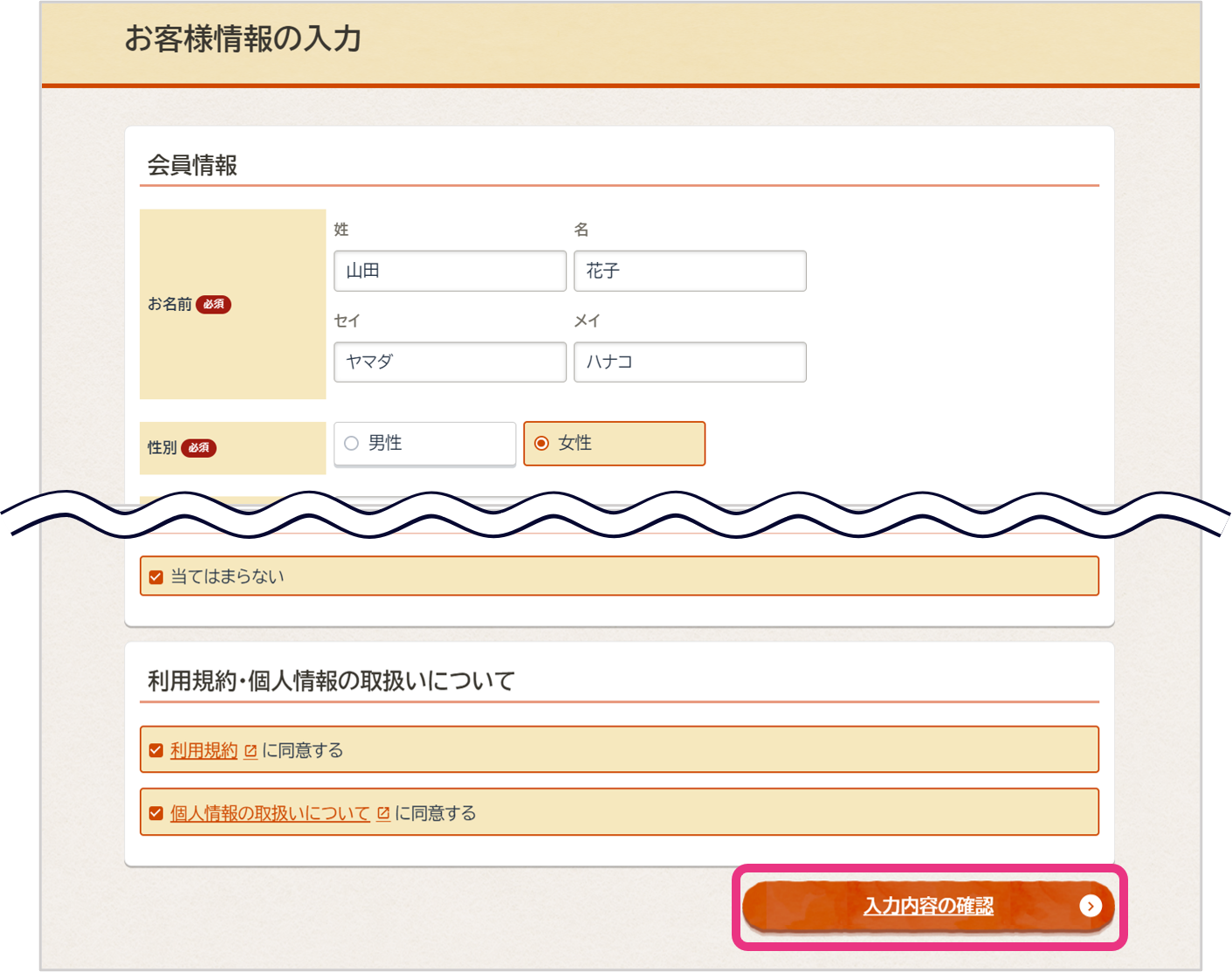 会員情報を入力し、『入力内容の確認』をクリックしてください。
