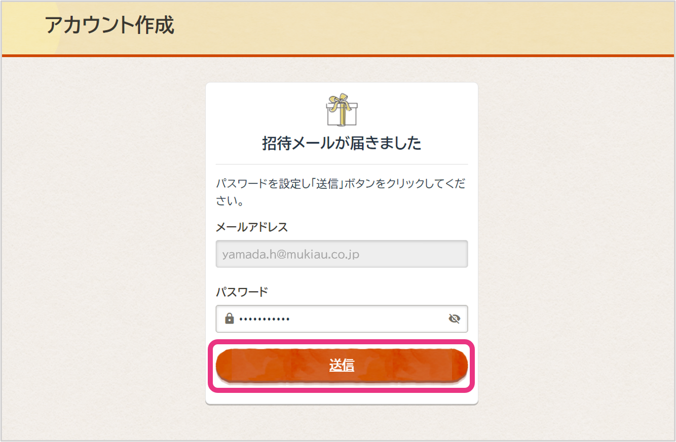 アカウント作成画面が開きますので、パスワードを指定し、『送信』ボタンをクリックしてください。