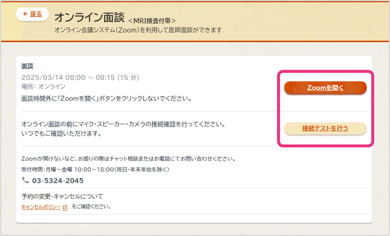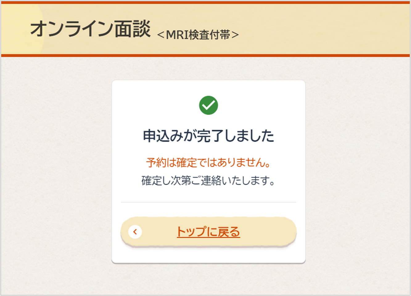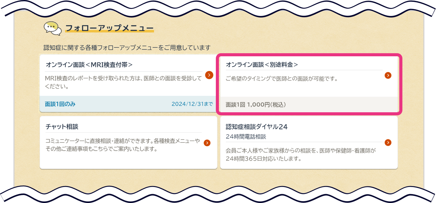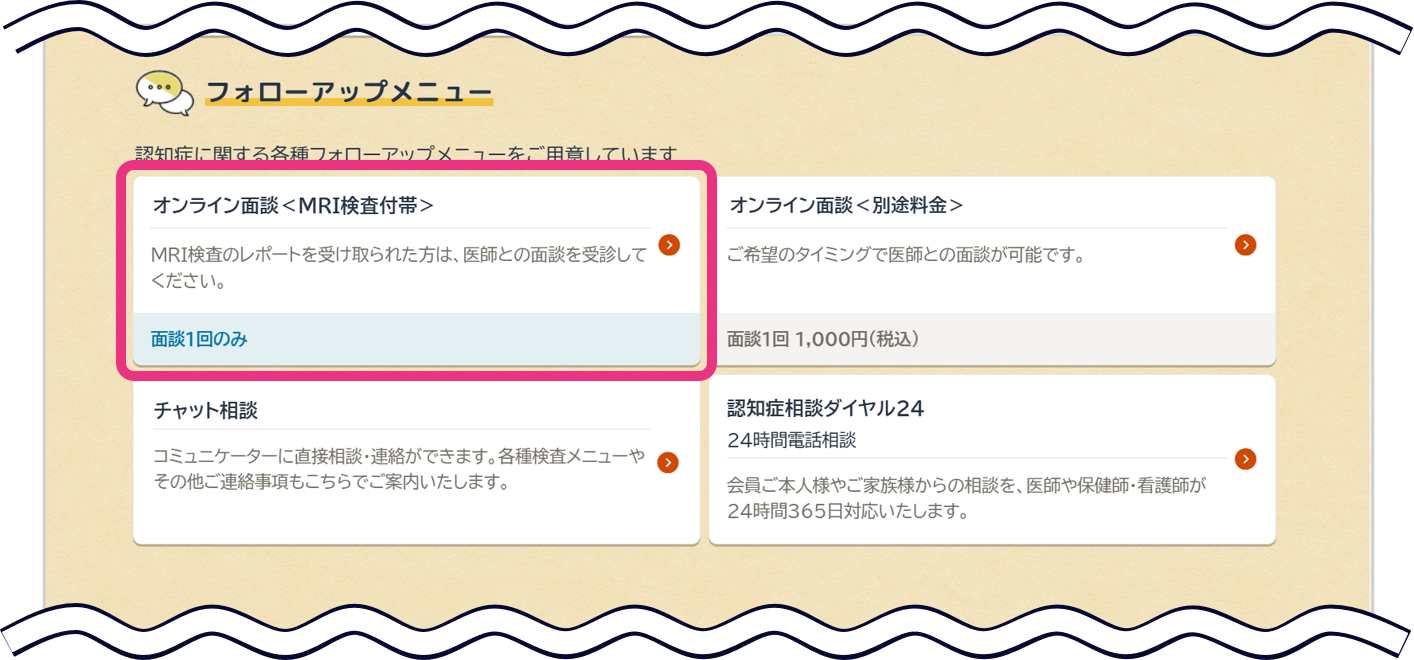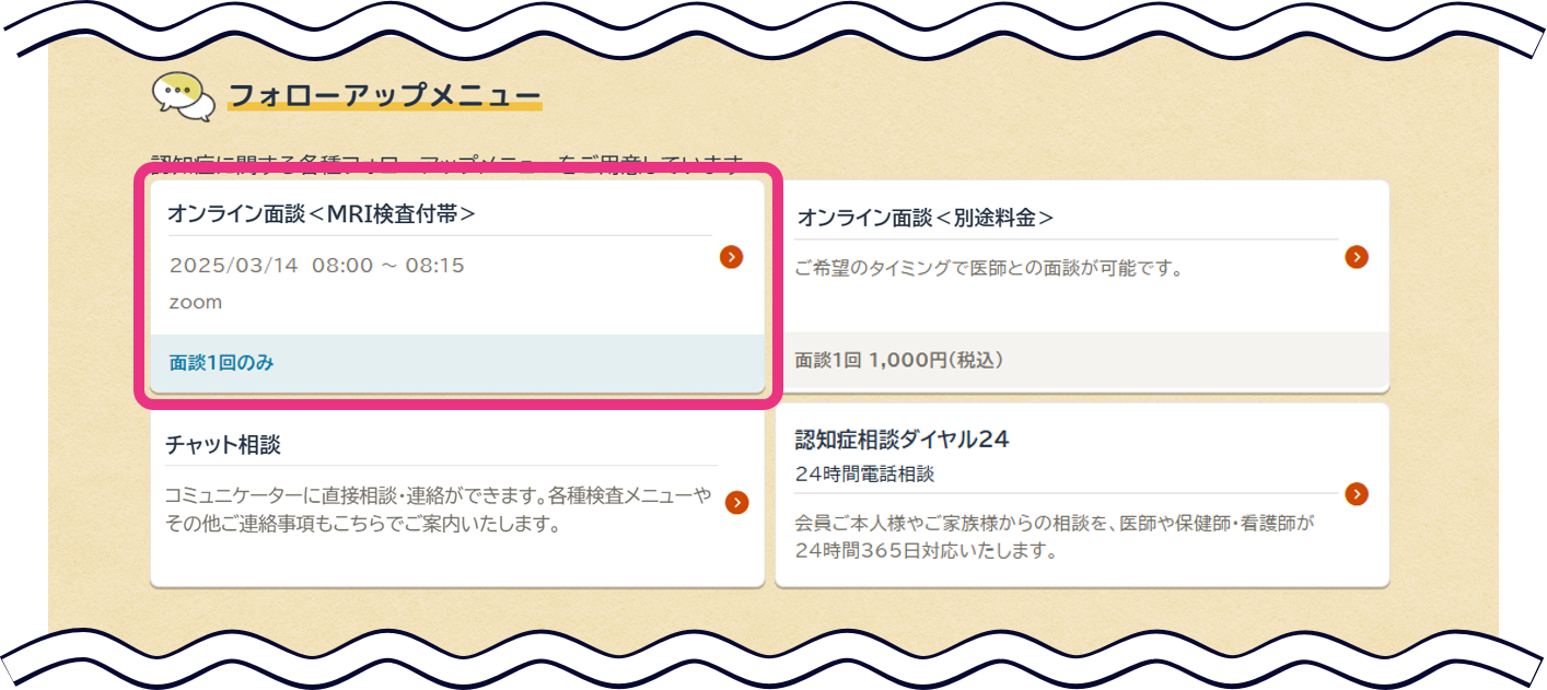 トップ画面から予約済みのオンライン面談(「オンライン面談<MRI検査付帯>」または「オンライン面談<別途料金>」)をクリックしてください。
