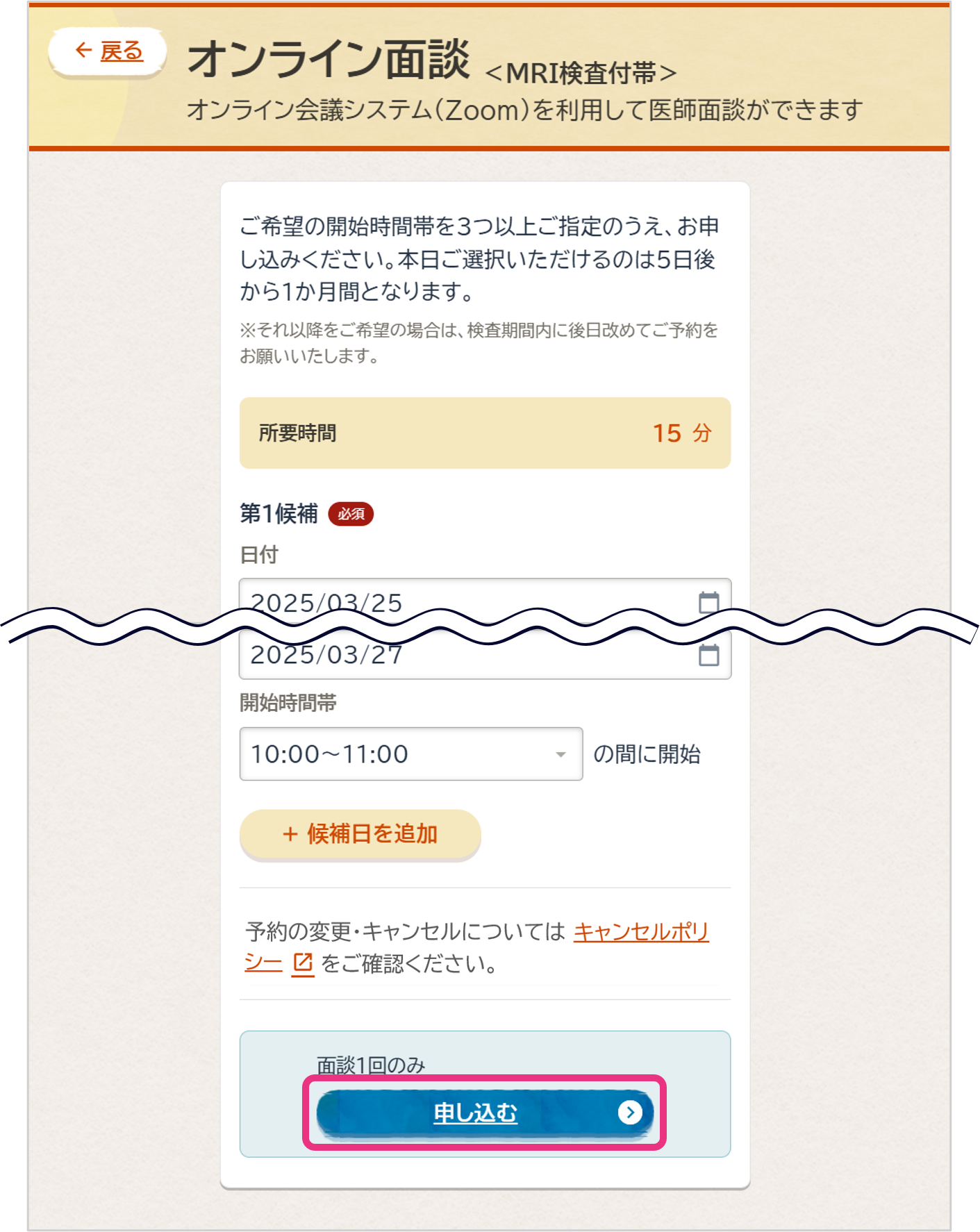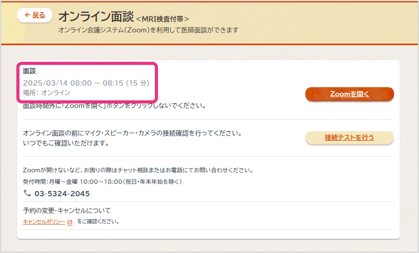 予約が完了したらトップ画面のオンライン面談枠(「オンライン面談<MRI検査付帯>」または「オンライン面談<別途料金>」)に面談日時が表示されます。日時を確認の上、クリックしてください。