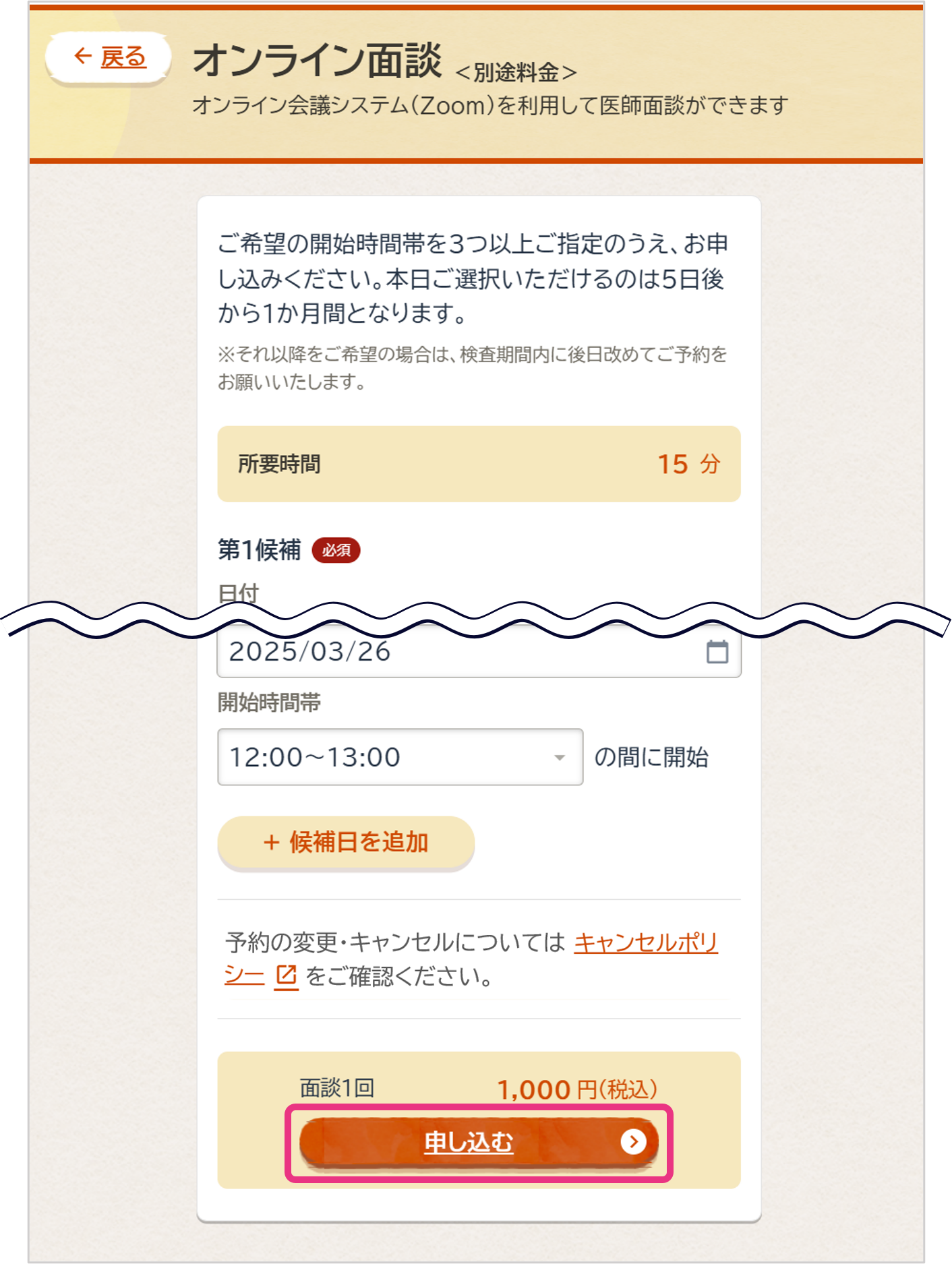 希望の面談開始時間帯を3つ以上選択し、「キャンセルポリシー」をご確認の上『申し込む』をクリックしてください。