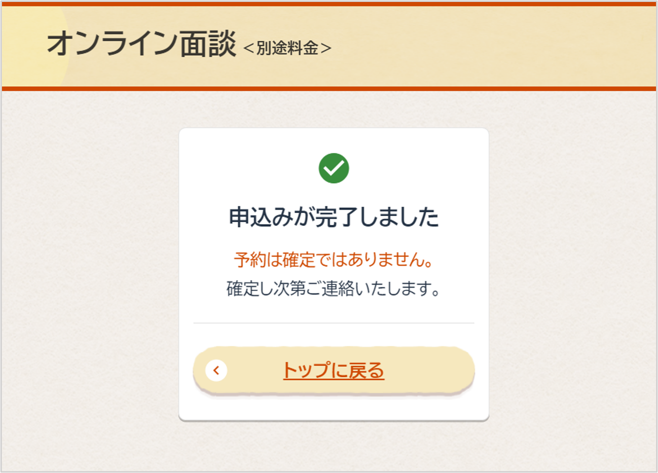 ご予約時に入力いただいたご希望の時間帯に面談枠の空きがなかった場合、ご予約が取り消しされ、「オンライン面談の仮予約を取り消しました」というメールが送信されます。別日程をご調整いただける場合は、再度ご予約をお願いいたします。