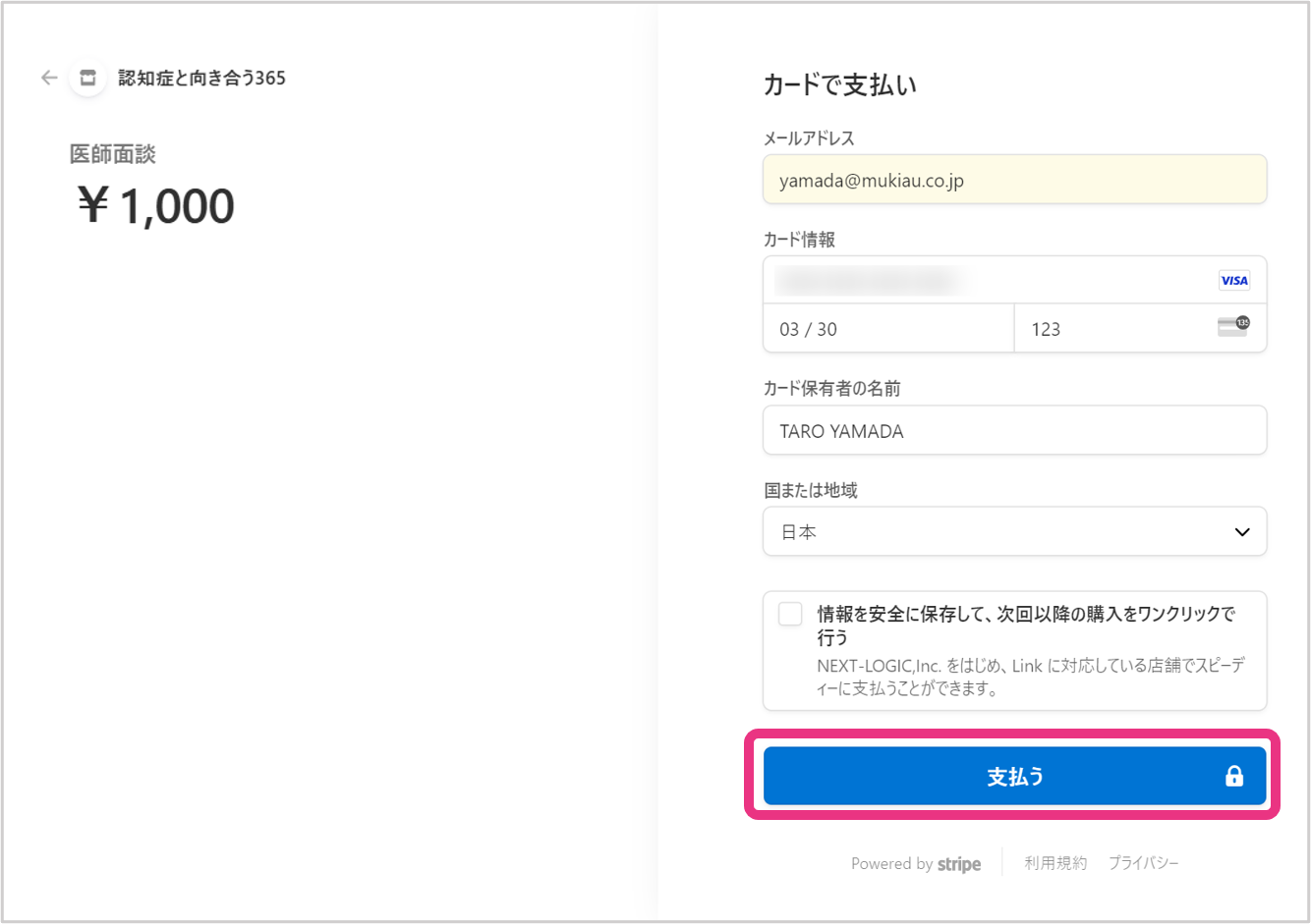 お支払いに利用するカード情報を入力の上、『支払う』をクリックしてください。