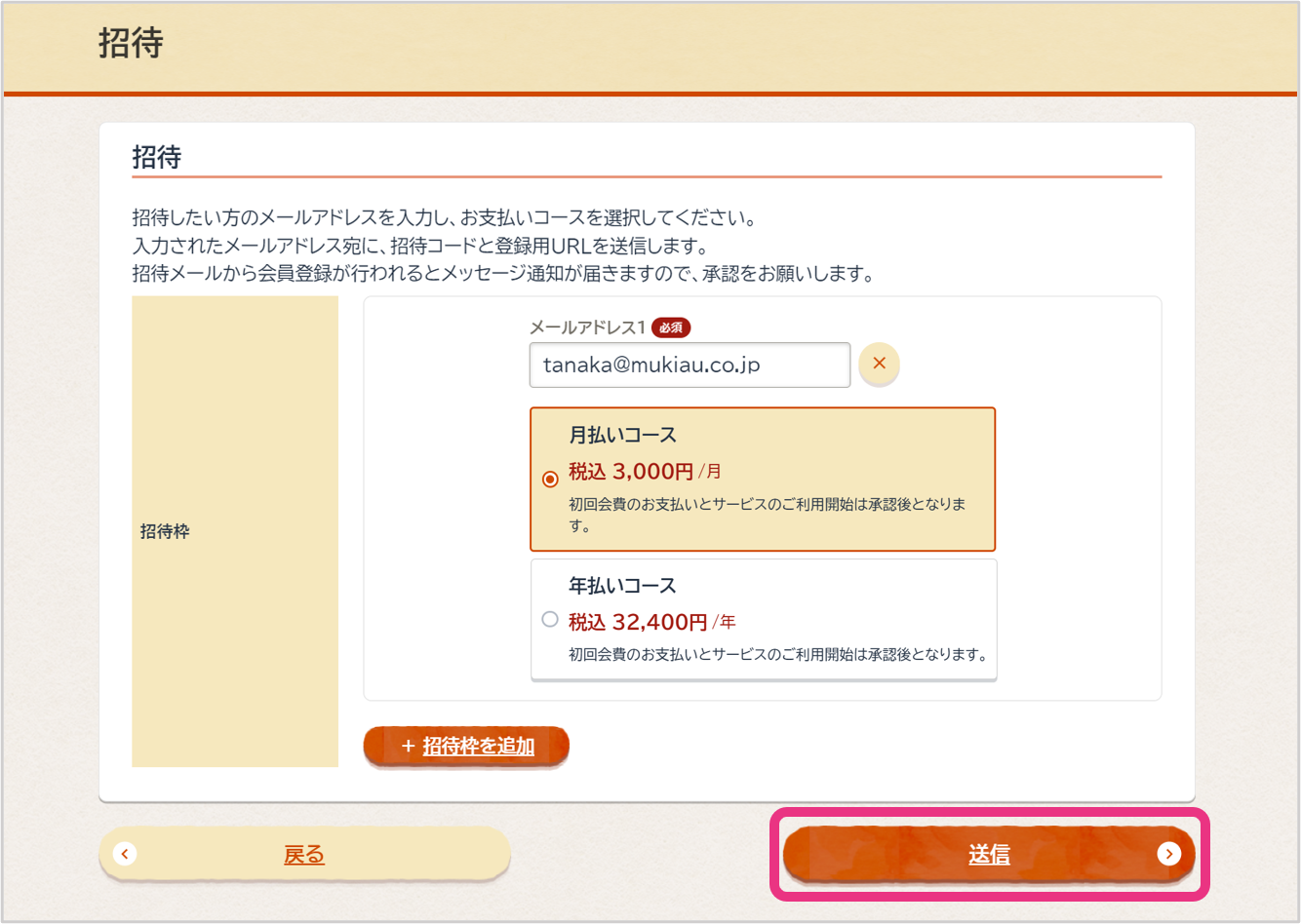 招待したい方(被招待者)のメールアドレスを入力し、お支払いコースを選択の上『送信』をクリックしてください。